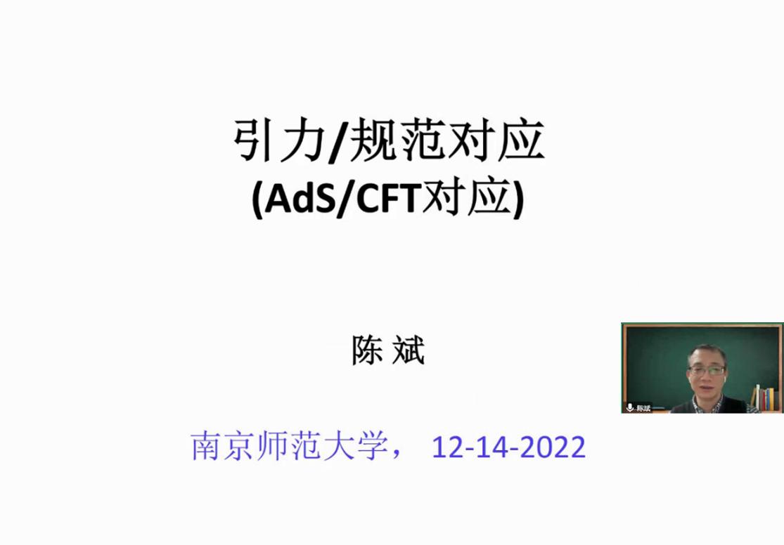 在报告之初,陈斌教授首先简要介绍了牛顿万有引力定律以及经典力学与量子力学的矛盾之处,而后介绍了爱因斯坦的广义相对论。接着,陈斌教授通过对近年诺贝尔物理学奖和引力量子化的讨论介绍了量子引力的最佳候选者之一:超弦理论,并在超弦理论的框架下讨论了规范/引力对应(AdS/CFT对应)这一过去20年中弦理论研究中的强有力的工具。最后,陈斌教授介绍了规范/引力对应在量子色动力学、凝聚态物理、量子信息等领域的应用。