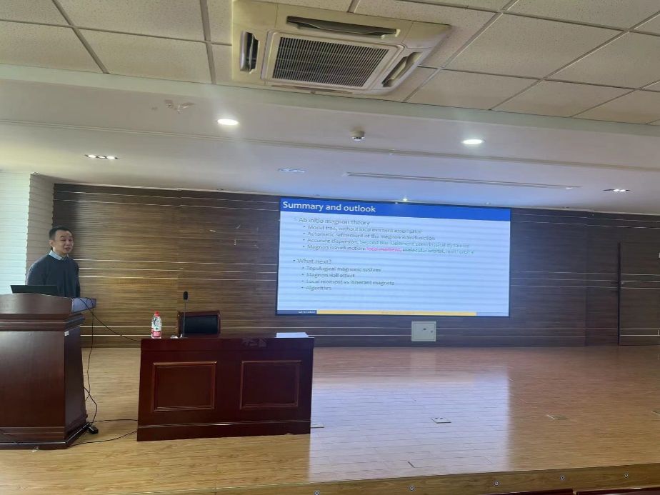 报告伊始,冯济教授向大家介绍了含时密度泛函理论和多体微扰论。密度泛函微扰论描述多电子体系对外场的线性响应, 可以用于声子和自旋波激发谱的计算。以此作为研究的出发点,冯教授发展了基于PAW方法的密度泛函微扰论的计算代码, 可以自洽计算有限动量和频率的电磁场下的一阶波函数,从而得出一阶的电荷和自旋密度, 以及有限频率和动量的四分量线性响应函数。该代码不仅能定量计算磁声子谱函数和色散关系, 也可以从头计算Stoner电子-空穴激发对磁声子的影响。进一步,基于密度泛函微扰论, 冯教授发展了不依赖于模型和局域磁矩近似的磁声子模式计算方法,用以计算磁声子的色散和波函数,在Niu-Kleinman动力学基础上进行能带的修正得到更为精确的磁声子色散。