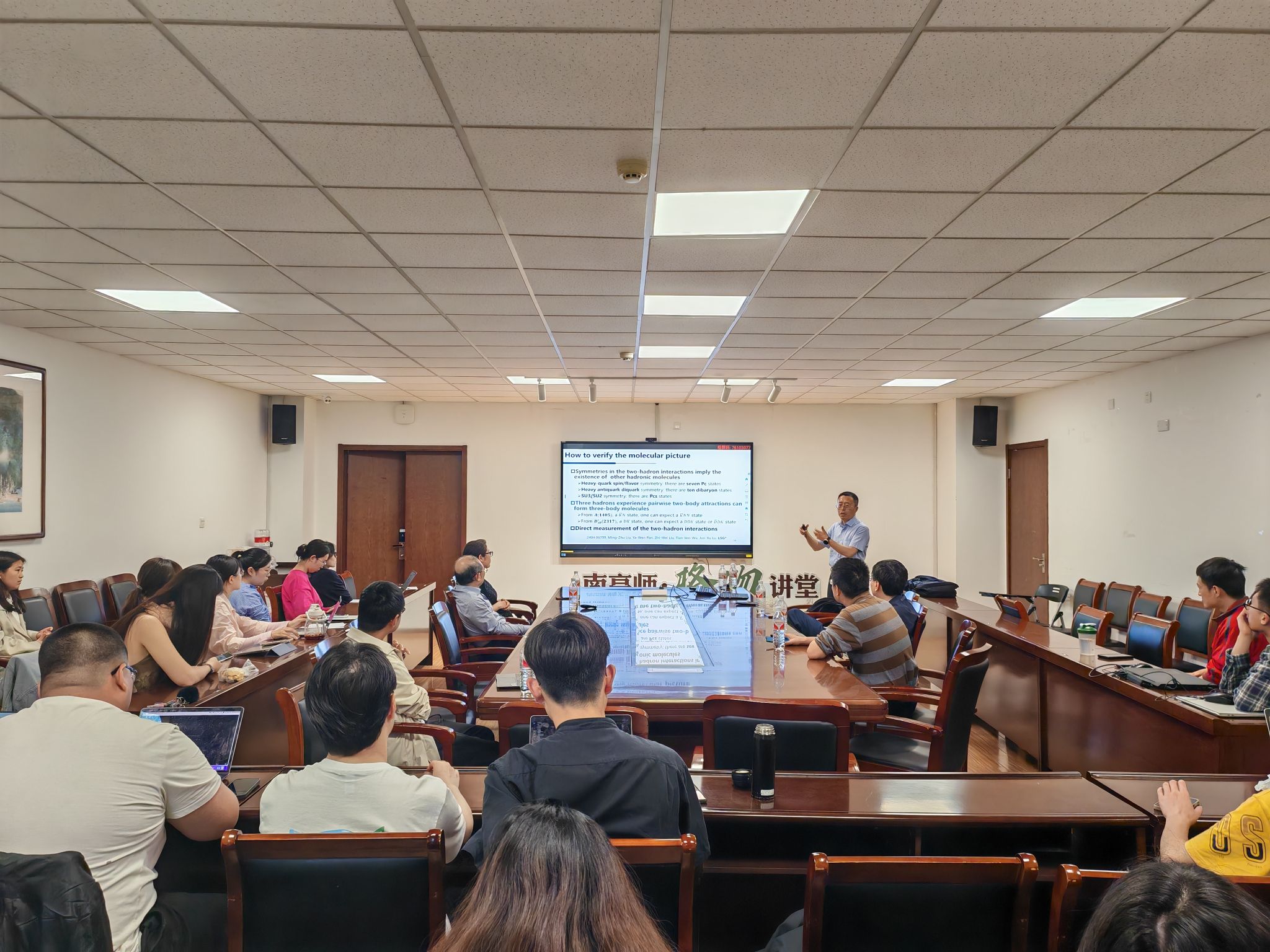 本次报告中,耿立升教授介绍了他们课题组最新的研究成果。以2003年Belle合作组发现X(3872)和BaBar合作组发现Ds0*(2317)为开端,各大高能物理实验陆续发现了一大批难以或不能被简单夸克模型解释的强子态,这些奇特强子态大多被解释为由普通强子构成的两体强子分子态。因此,如何检验奇特强子态的分子态图像成为了当前理论和实验物理学家共同关注的重要前沿课题,对深入理解非微扰强相互作用至关重要。本报告简要介绍三个可以鉴别分子态图像的系统方案:1)寻找对称性伙伴态(多重态);2)寻找三强子分子态;3)利用费米镜技术精确测量强子分子态组分和强子间相互作用。本次精彩的学术报告让参加的师生受益匪浅,不仅了解奇特强子态的分子态图像,掌握最新研究方向与动向,也激发了同学们的科研热情,帮助个人凝炼研究方向,为进一步营造校园科研氛围,推动校园文化建设夯实根基。