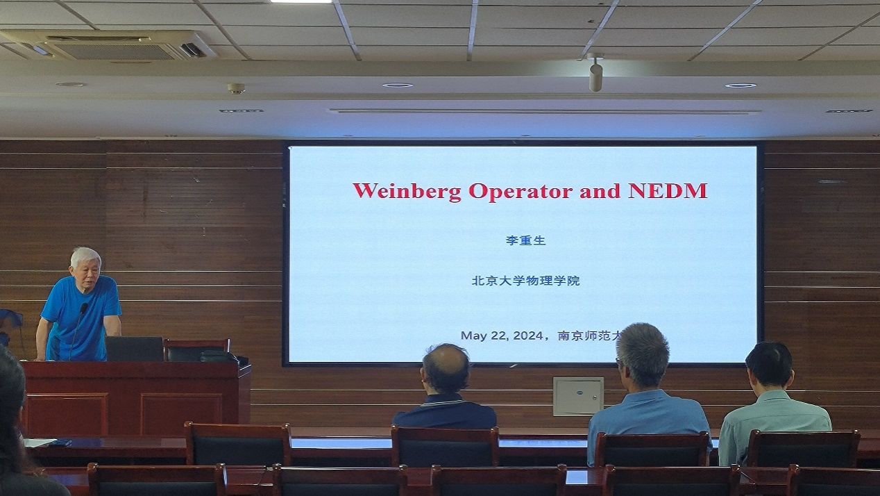 在这次历史回顾类型的报告中,李重生教授结合自己关于Weinberg Operator(温伯格算符)的研究中产生的名人轶事,给与会师生带来了一场对学术研究与研究生培养具有启迪意义的精彩讲演。李教授首先回顾了,著名粒子物理学家Weinberg在1989年关于三胶子场强构成的CP破坏算符(Weinberg Operator)对中子电偶极矩(NEDM)可产生贡献的研究。其中Weinberg及其合作者强调了QCD 演化效应对这种贡献的显著提高,并结合NEDM的实验上限值,对粒子物理模型的CP破坏起源给出很强的约束条件,该发现很快引起国际高能物理界的高度关注,曾被认为是粒子物理的一个重要进展。李教授及其合作者也被这一结果引起了极大的兴趣,并对此做了深入研究。他们换了一种更加有效的方法,发现 QCD演化效应并非增强而是减弱对NEDM的贡献若干量级,使得上述算符给出的NEDM值比原来认为的小了若干量级,从而放宽了对CP破坏起源的限制,使许多超出标准模型的新物理模型仍然得以生存。该结论立即在国际高能物理界产生了强烈反响,温伯格教授公开肯定了这个结论的正确性,并在随后发表的论文中加以重点引用。