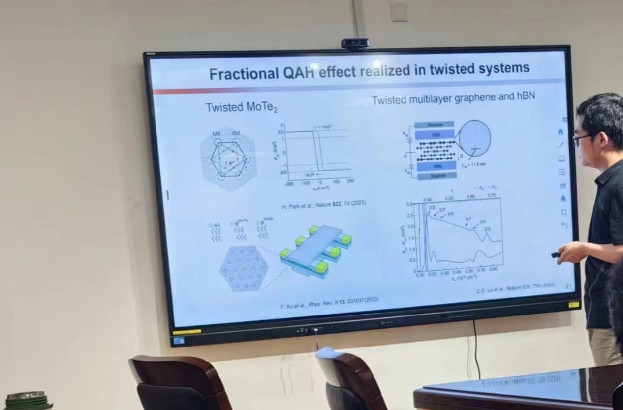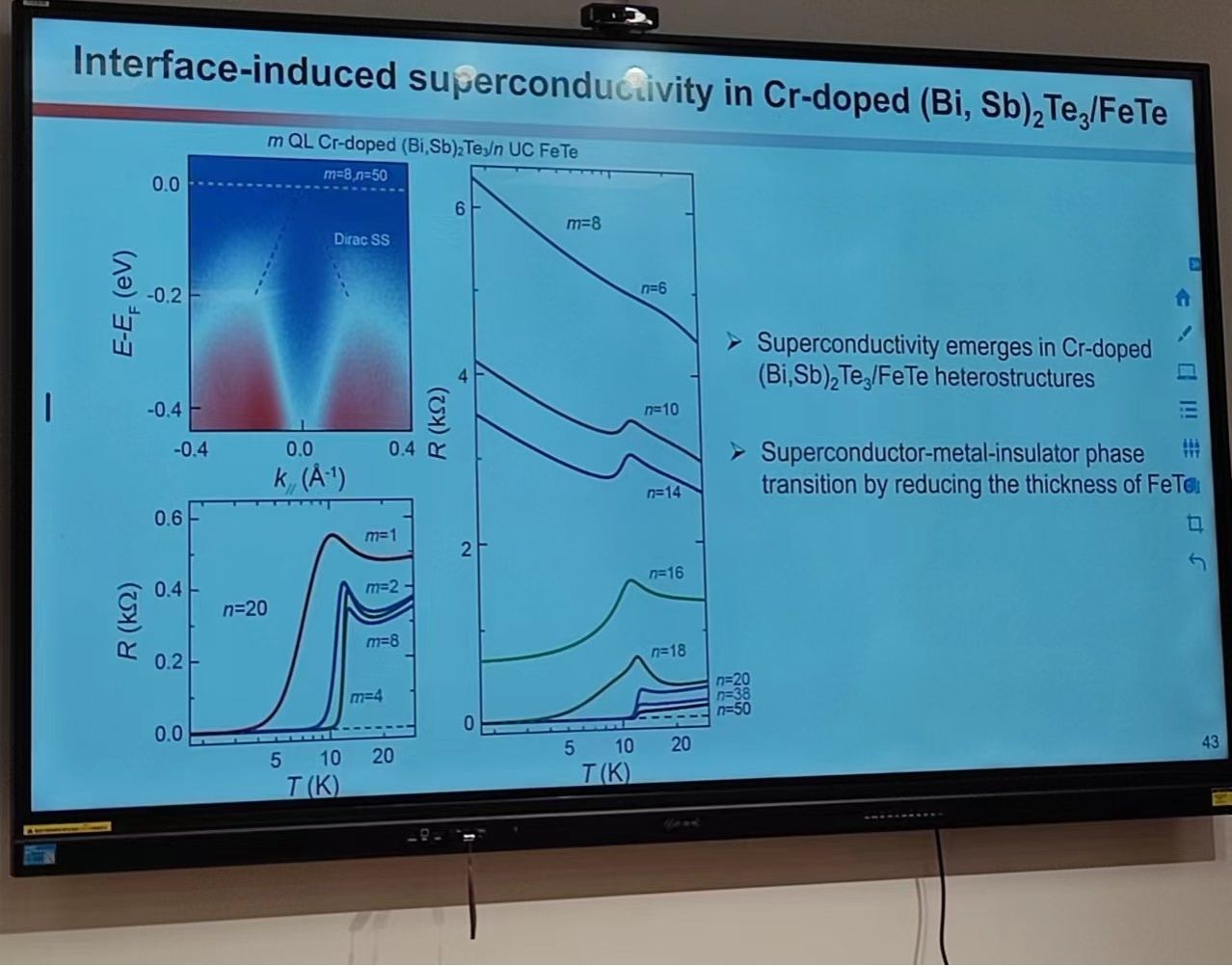 讲座伊始,伊副教授深入浅出地介绍了分子束外延技术(MBE)在材料生长中的应用、角分辨光电子能谱(ARPES)对材料性质的表征手段,以及从霍尔效应家族到拓扑绝缘体(TI)这一科学历程的背景知识,为听众构建了一个扎实的理论基础。随后,他详细阐述了在三种不同界面上超导现象的实现机制,包括界面诱导的超导、超导邻近效应以及界面超导的增强效应,并引出了拓扑超导体的前沿概念,进一步拓宽了听众的学术视野。最后,伊副教授分享了最新的科研成果:在Bi2Se3/单层NbSe2异质结构中,科研团队观察到了从Ising到体Rashba型超导配对的独特交叉现象;同时,在Cr掺杂的(Bi,Sb)2Te3/FeTe异质结构中,实现了超导性、铁磁性与拓扑态的共存,这一发现不仅为强关联领域中超导与铁磁相互作用的研究开辟了新路径,更对深入理解新型量子材料的物理特性及推动未来量子技术的发展具有深远的意义。