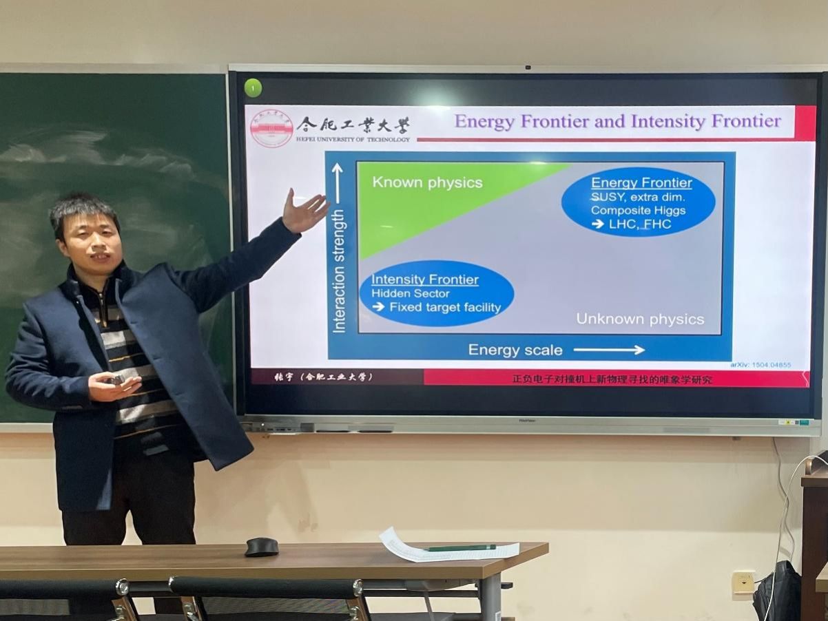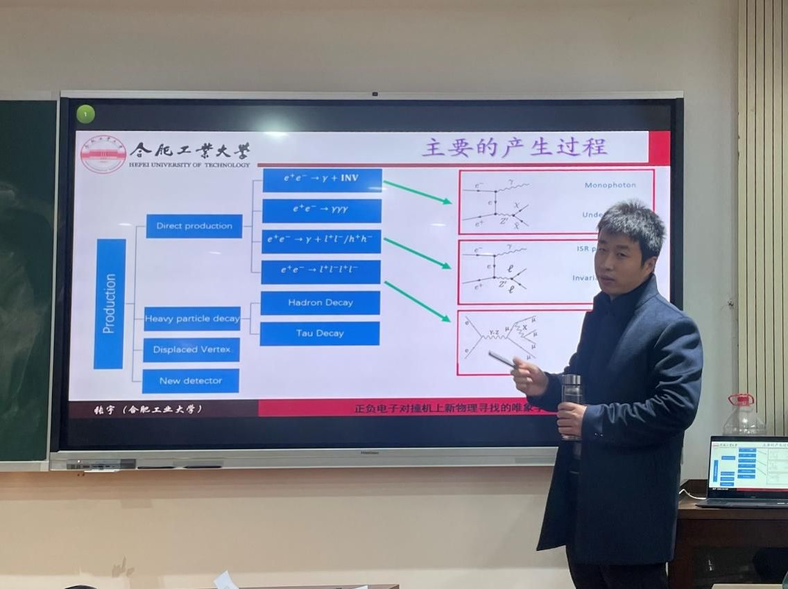 接下来,张宇副教授结合自己的工作,介绍了唯象学模型在新物理研究中的应用,详细阐述了在正负电子对撞机中如何探测新物理现象,以及利用正负电子对撞机提供的数据,通过理论分析推动对新物理现象的探索。