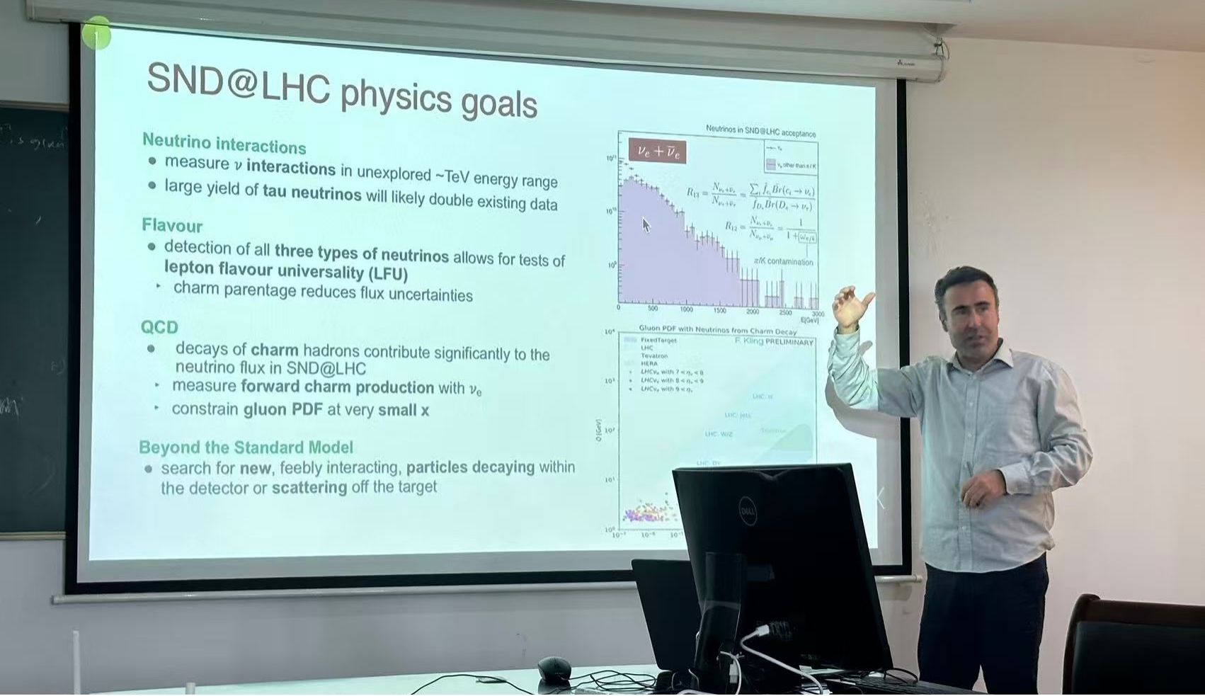 Leonardo教授还介绍了当前他所参与的多个国际大型实验项目,包括通用探测器CMS、最新的SND@LHC探测器、未来的高亮度LHC(HL-LHC)以及SHiP实验。他重点讲解了这些实验在研究强子物质状态、探测中微子及其他弱相互作用粒子方面的前沿进展与科学目标,为在场听众呈现了一幅当代粒子物理探索图景。